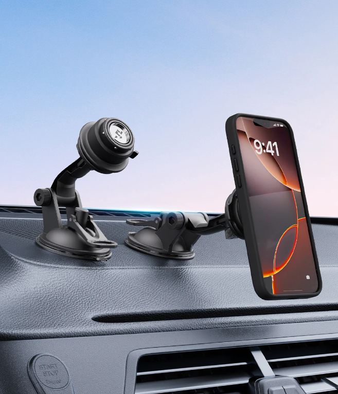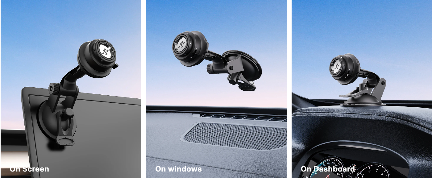 車のフロントウィンドウにバキュームタイプの吸盤で取り付けができるのはもちろん、接着剤付の付属プレートを張り付ければダッシュボードなどにも固定ができます。